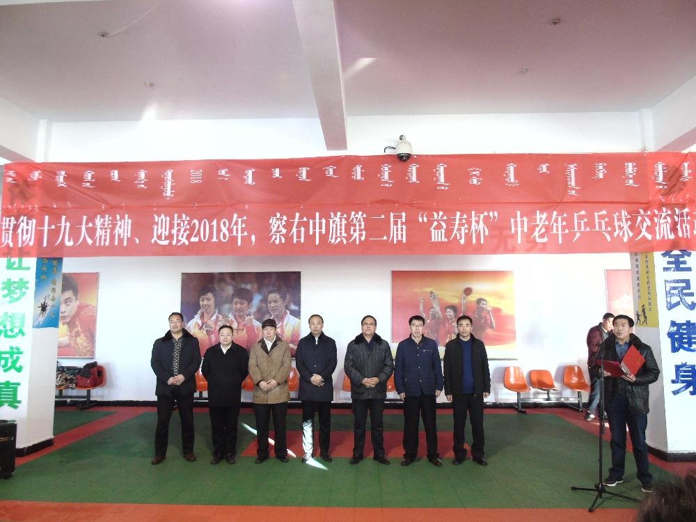 为进一步纵深贯彻十九大精神,迎接2018新的一年的到来,察右中旗第二届“益寿杯”中老年乒乓球交流活动隆重举行。该活动是由旗教育科技体育局主办、相关单位协办,并于2017年12月21日在察右中旗第二中学乒乓球活动中心举行盛大开幕式,出席开幕式的领导有:旗委常委、组织部部长梁建华,旗政府副旗长郑东平,旗委调研员、老年体协主席乌宁吉雅,旗革命老区促进会会长巴雅尔,旗委老干局局长李广,旗教育科技体育局副局长、老年体协副主席史保全,旗民政局副局长、老年体协副主席路长征及旗老年体协副主席闫建平。全旗各机关单位代表队参加开幕式,活动在参赛队员代表和裁判代表对本次比赛的庄重宣誓中正式开始。