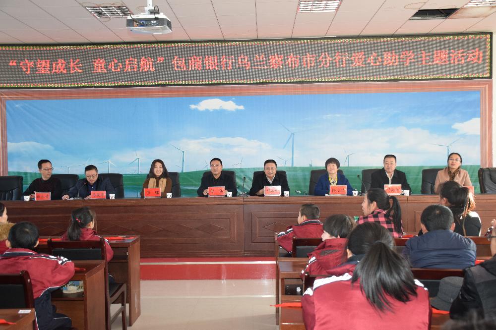 包商银行乌兰察布分行孙书记在活动上致词:“守望成长·童心启航”爱心助学活动,是由包商银行乌兰察布分行的10名职工与我旗的10名贫困学生开展为期3年的一对一结对帮扶活动,每年资助每人600元,并在元旦、六一等特殊节日组织这些贫困学生去乌兰察布市参加包商银行乌兰察布分行组织的各类参观、娱乐等活动。旨在体现该行让贫困学生感受社会大家庭的温暖。