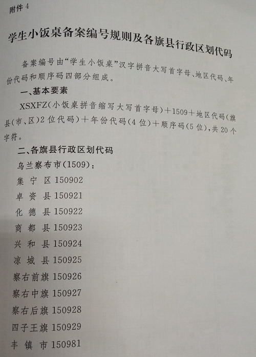 第十九条 学生小饭桌备案卡编号由XSXFZ(“学生小饭桌”的汉语拼音字母缩写)和15位阿拉伯数字组成。数字从左至右依次为:6位地区代码、4位年份代码和5位顺序码。(具体见附件4)