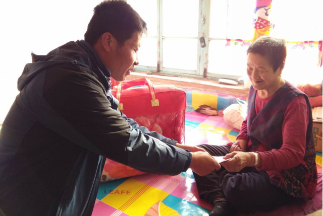 帮扶干部每到一户贫困户家中,都十分关切地询问贫困户家中情况,了解其所急所需,并为其送上毛毯等慰问品,特别是在贫困户张二女家中,刘主任详细了解了其过冬取暖等生活情况并为其送上了慰问金,张二女的脸上露出了幸福的微笑。